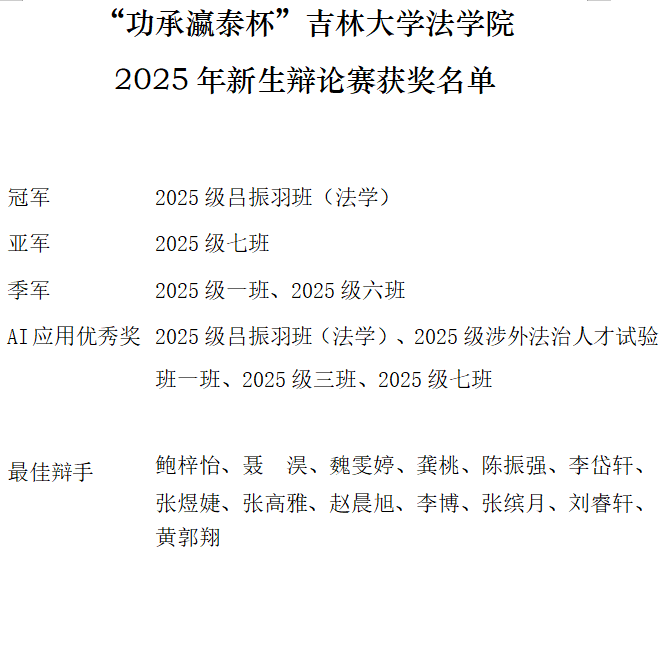 历经十余载深耕,“功承瀛泰杯”吉林大学法学院新生辩论赛已超越竞技本身,化作初入吉大法学院的学子感知法学魅力、淬炼思辨锋芒的交流平台。新生们以逻辑为刃、以法理为盾,在观点交锋中叩问法治内核,在思想碰撞里厚植人文情怀。赛事终章亦是新程起点,期待法苑学子将思辨精神融入专业研习,以锐利视角洞察社会,以青春担当守护正义,于法治星空下书写属于新一代法律人的璀璨篇章。