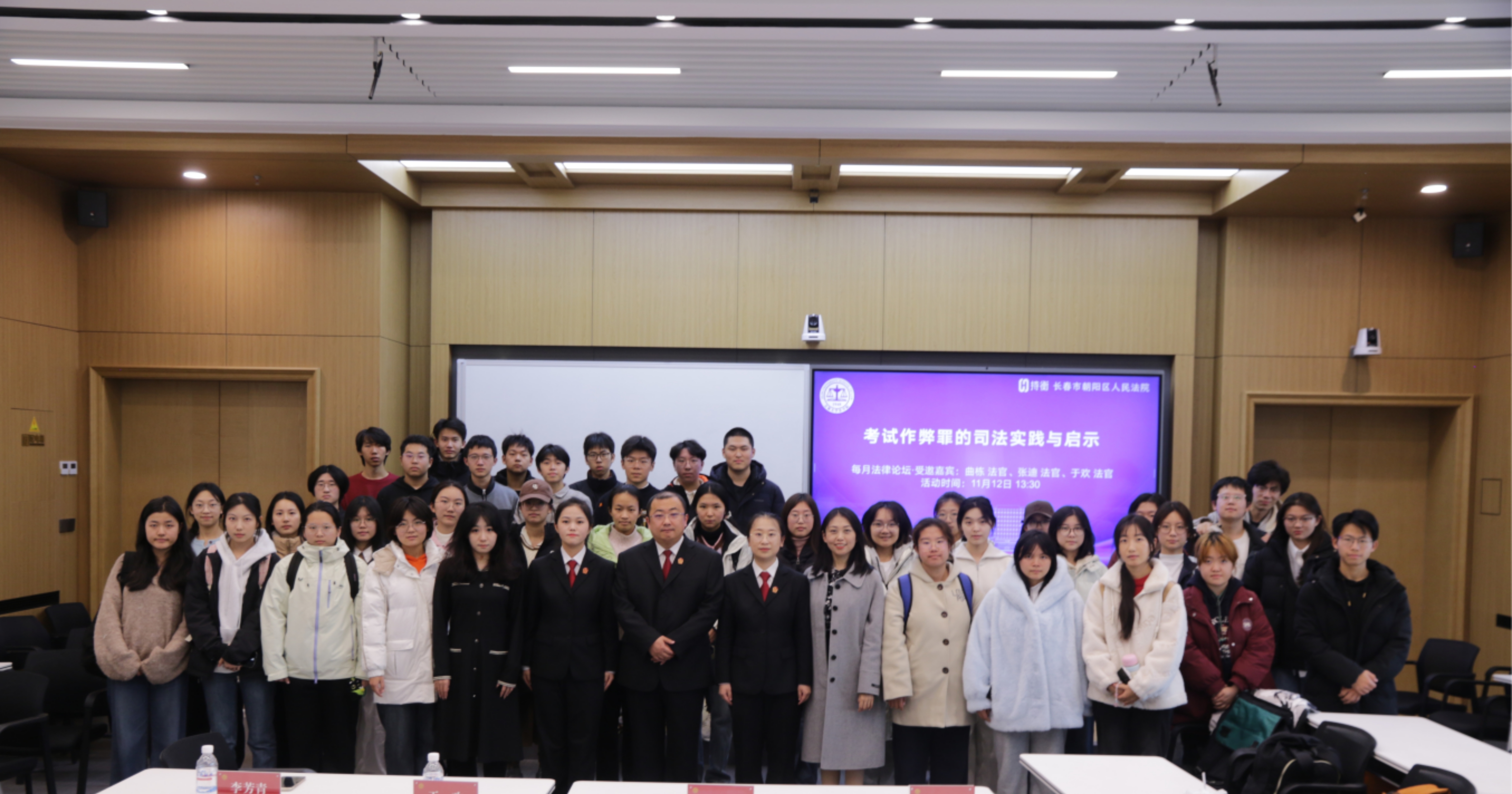 为延伸庭审观摩的学习成果,11月12日,吉林大学法学院举办“每月法律论坛”,特别邀请参与该案审理的长春市朝阳区人民法院刑事审判庭副庭长曲栋、员额法官张迪、于欢走进学院,与师生围绕“考试作弊罪的司法实践与启示”展开深度对话。法学院党委副书记(兼)副院长马旭、2025级本科生辅导员李芳青出席活动。