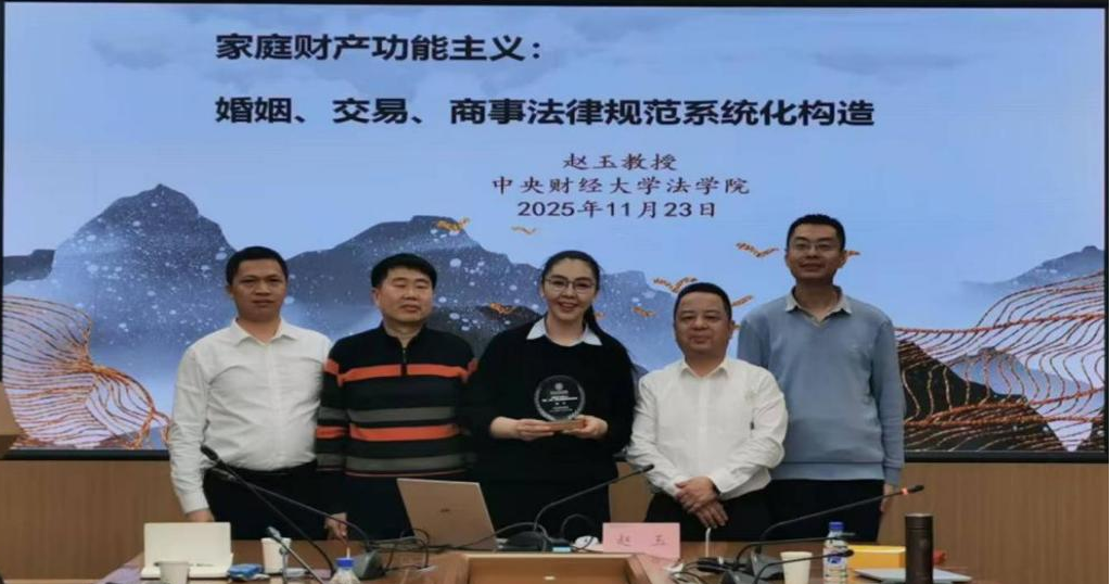 2025年11月23日下午,吉林大学法学院法学学术茶座第160期在法学楼A428会议室举行。中央财经大学法学院赵玉教授以“家庭财产功能主义:婚姻、交易、商事法律规范系统化构造”为题,为师生带来一场精彩学术讲座。本次讲座由曹险峰教授主持,李拥军教授、曹相见教授、刘国栋副教授与谈,我院部分师生参与本次讲座。