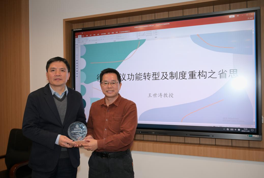 讲座伊始,沈寿文教授简要介绍了王世涛教授的学术方向和研究成果,并对王世涛教授的到来表示了热烈的欢迎和诚挚的感谢。在讲座中,王世涛教授以行政复议价值权衡切入,引出核心问题。继而,王教授以新《行政复议法》为背景,深入剖析了行政复议的功能转型及功能转型背景下行政复议的制度设计,并在此基础上提出了行政复议制度的优化方案。最后,王教授将探讨升华至根本定位问题,即行政复议的归依应当是法治主义抑或是功能主义。