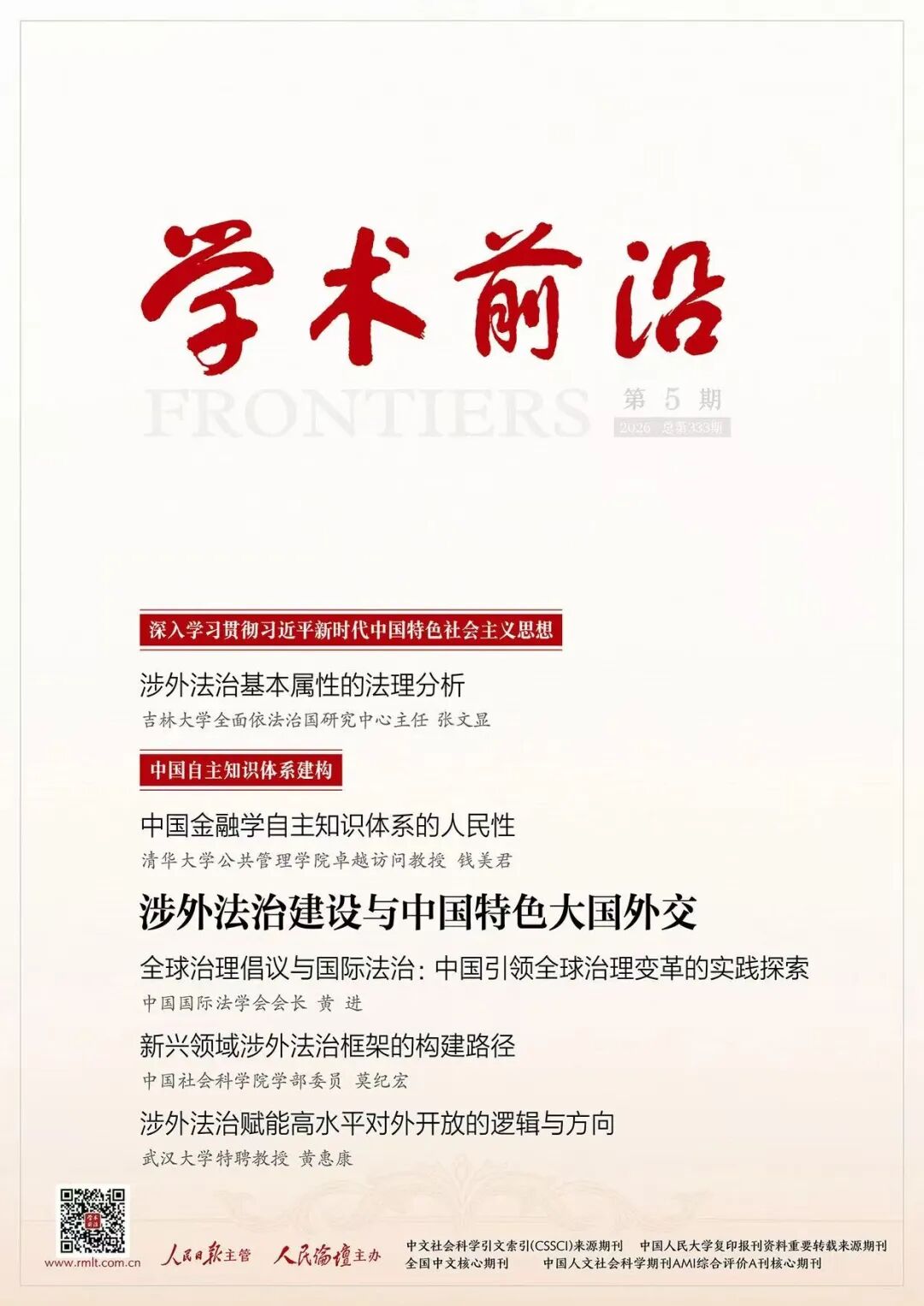 近日,《学术前沿》2026年第5期刊发了我院张文显教授的学术论文《涉外法治基本属性的法理分析》。